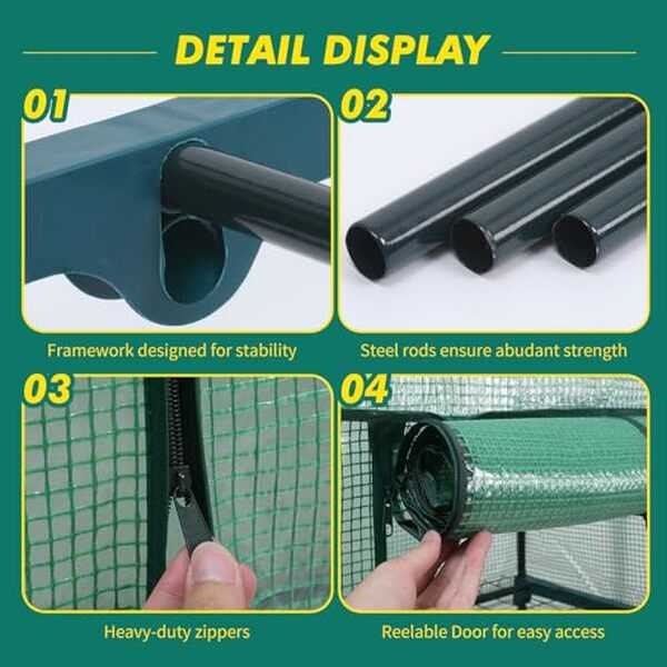 LATERN 4 Niveaux Mini Serre, 160CM x 70CM x 50CM Petite Serre Étagères Cadre et Transparent Imperméabiliser PVC Couverture avec Enroulable Zippée Porte pour Protection Contre Froid Gel Vent Pluie[Haute qualité] Fabriqué en acier allié et PVC de haute qualité, structure robuste et capacité de charge élevée, difficile à déformer et à casser, difficile à déchirer et à fissurer, coutures solides, peut résister aux vents violents et aux orages, etc. [Mini serre] Protège les plantes du vent, de la pluie et du froid. Sa bâche transparente en PVC laisse passer la lumière du soleil, favorisant ainsi leur croissance. Elle offre également une meilleure visibilité, permettant d'observer facilement les plantes de l'extérieur. [Facile à utiliser] Montage facile sans outils ; conçu avec une porte enroulable à fermeture éclair de chaque côté, facile à ouvrir et à fermer en toute sécurité, pour une meilleure ventilation ; il suffit d’ouvrir la fermeture éclair, d’enrouler la porte et de la fixer avec les attaches intégrées [Dimensions] 160 cm x 70 cm x 50 cm. Dimensions de chaque niveau : 33 cm x 70 cm x 50 cm. Charge maximale par niveau : 8 kg. Optimisation de l'espace de plantation. Les étagères sont amovibles pour s'adapter à la croissance des plantes plus hautes. [Applicable] Idéal pour le semis et la culture de jeunes plants, la protection contre le gel, le froid et les parasites, et à des fins décoratives ; convient aux petits espaces : jardins, potagers, terrasses, balcons, etc.