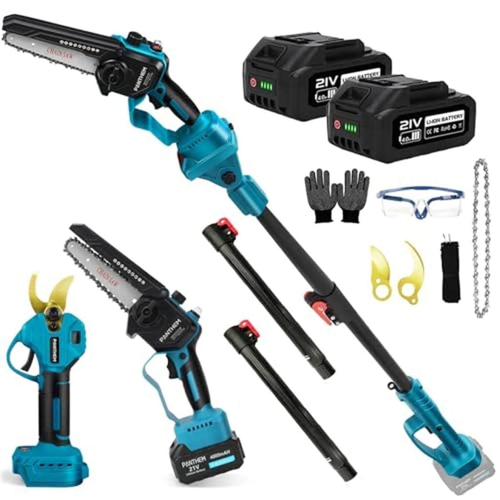 panthem Élagueuse sans fil 4 en 1 - 15,2 cm - Mini tronçonneuse - Compatible avec Dewalt 20 V 18 V - 45 mm - Sécateur - Sécateur à main - Scie à élaguer télescopique (sans batterie)Veuillez en tenir compte Veuillez utiliser des batteries d'origine, les batteries non d'origine ne sont pas applicables - Le long jeu de tronçonneuse télescopique et de sécateur est compatible avec Dewalt 18V 20V, DCB180, DCB181, DCB182, DCB183, DCB201, DCB201-2, DCB200, DCB200-2, DCB204-2, DCB205-2 et plus (sans batterie et chargeur) Conseils : Choisissez des batteries d'une capacité de 4,0 Ah ou supérieure pour éviter une coupure due à une surcharge Puissante et durable - Scie à chaîne avec batterie conçue avec un puissant moteur sans balai à l’intérieur, le moteur sans balai augmente la puissance de sortie et réduit l’usure, pour plus d’endurance et une durée de vie prolongée. Les scies électriques sont moins sujettes à la surchauffe pendant l'utilisation, la mini-tronçonneuse est plus efficace, plus légère, plus durable, plus sûre, parfaite pour les débutants, les femmes et les personnes âgées 180° d’angle de rotation, la tige télescopique vous permet d’atteindre jusqu’à 4,5 m de hauteur (en ajoutant la taille de la personne) - La tige à branches hautes dispose d’un angle de rotation de 90°, vous permettant d’ajuster facilement l’angle de coupe et de sciage pour l’adapter à différents environnements de travail et besoins. Le taille-haies télescopique peut être télescopique de 4,5 m à 8,5 m et jusqu’à 15 m, pour l’aménagement paysager domestique et professionnel Tronçonneuse de 6 pouces et sécateur à batterie 45 mm - 4 en 1, élagueuse avec tige télescopique, scie télescopique pour arbres, mini tronçonneuse à chaîne et sécateur à batterie pour branches, Facile à utiliser : il suffit de double-cliquer pour déverrouiller le sécateur et c’est parti, Il peut également être utilisé comme petite tronçonneuse à main portable, Les élagueuses conviennent pour le jardinage domestique et l’aménagement paysager professionnel, et l’angle de la lame de scie permet de tailler facilement les branches, Également adapté pour l’abattage et la coupe de bois Mini tronçonneuse 4 en 1 avec batterie, élagueuse télescopique, tronçonneuse manuelle, élagueuse sans fil - panthem Cet électroportatif 4 en 1 est doté d’une tige télescopique amovible qui peut être démontée en quatre sections et installée en trois longueurs différentes : 1,43 m / 2 m / 2,59 m. En tenant une tronçonneuse à haute portée, la hauteur maximale peut atteindre 4,6 mètres, vous permettant d'atteindre facilement les branches hautes pour faciliter l'élagage des branches hautes